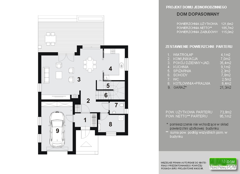 Projekt domu jednorodzinnego DOM DOPASOWANY to propozycja dopasowana pod wieloma względami dla wielu użytkowników. DOM DOPASOWANY idealnie wpasuje się w niemal każdą działkę, jego niewielkie wymiary gwarantują, że zmieści się on na bardzo wąskiej działce, której szerokość nie przekracza 18,5 m. DOM DOPASOWANY to projekt domu, który wpasuje się w niemal każdy budżet. Jego powierzchnia użytkowa (121,6 m2) gwarantuje relatywnie niskie koszty budowy, a jego układ wewnętrzny oparty na kwadracie o boku 10,5 m, gwarantuje optymalizację wykorzystania zarówno materiałów, jak i wszelkich robót budowlanych. Ponadto, jego powierzchnia kwalifikuje go do grupy projektów, które można zrealizować w ramach programu Rodzina na swoim. DOM DOPASOWANY to wreszcie projekt domu, który wpasuje się w każdy gust, projekt ten reprezentuje wyrafinowany styl polskiego budownictwa jednorodzinnego, którego urokowi trudno się oprzeć. Jego forma kryje w sobie wyrafinowaną prostotę funkcji, zaprojektowanej z dbałością o każdy metr kwadratowy powierzchni. Układ funkcjonalny jest gruntownie przemyślany pod kątem stworzenia jak najlepszych parametrów użytkowych, dających poczucie wygody i komfortu jego użytkownikom. Wygodny i przestronny salon funkcjonalnie powiązany z jadalnią, kuchnia z możliwością wydzielenia od salonu (szerokie drzwi przesuwne) oraz z własną spiżarnią. Pomieszczenia gospodarcze, w którym miejsce znajdzie piec gazowy i pralka, garaż oddzielony od reszty parteru wiatrołapem - to program funkcjonalny dopasowany do szerokiej gamy potrzeb wielu użytkowników. Poddasze, kryjące trzy wygodne sypialnie (w tym jedna z własną garderobą), doświetlone urokliwymi trójkątnymi lukarnami, przestronna łazienka, to gwarancja swobody dla rodziny o modelu 2+2. Projekt domu jednorodzinnego DOM DOPASOWANY to wygodny i przestronny parter oraz funkcjonalne i proste poddasze. Urokliwa bryła oparta na nieskomplikowanym rzucie zamkniętym w kwadracie, to również ergonomia rozwiązań i ekonomia wykonania. Wszystkie cechy wymienione powyżej sprawiają, że projekt domu jednorodzinnego DOM DOPASOWANY świetnie dopasuje się do Państwa gustu, portfela, a przede wszystkim doskonale dopasuje się do Państwa stylu życia. Zobacz podobne projekty domów do projektu domu DOM DOPASOWANY: ![]() Projekt domu jednorodzinnego DOM DOPASOWANY ES ![]() Projekt domu jednorodzinnego DOM DOPASOWANY XL Dane techniczne: